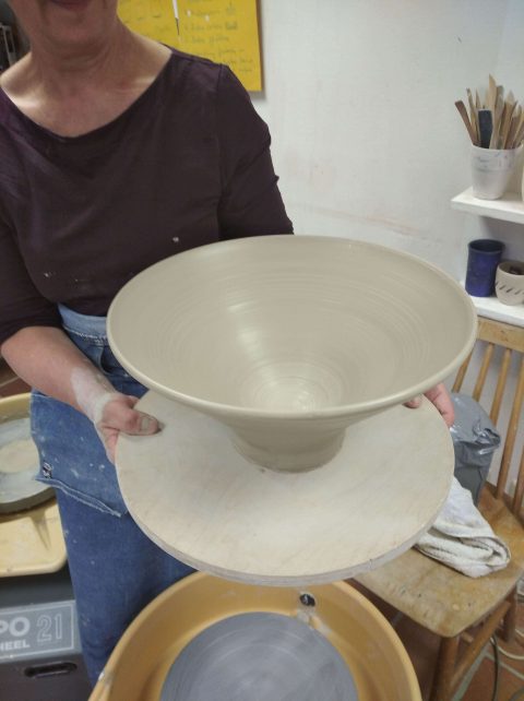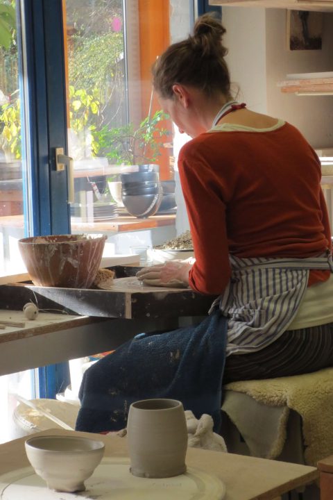 Wer noch nie auf der Töpferscheibe gedreht hat, muss erst mal das Zentrieren lernen. Was ist das denn, Zentrieren? Hierbei müssen wir den Ton zum ruhigen Laufen bringen, erst dann können wir ihn formen wie wir möchten. Auch die Wandung Formen will geübt werden. Viele verwenden im Zusammenhang mit der Wandung und dem Gestalten des Topfes den Begriff „ziehen“. Ich persönlich verzichte auf dieses Wort komplet in meinem Unterricht – er irritiert, denn wir dürfen nicht ziehen wir arbeiten mit Hilfe der Rotationskraft und Druck. Das alles erkläre ich im Unterricht genauer 😉 und läßt sich durch die Praxis auch gut verstehen! Da es sich um einen kompexen Lernprozess handelt, gebe ich als kleinste Einheit einen zwei Tageskurs mit zusätzlichem Abdrehtermin. So ist auch am Sonntag nochmal Zeit das Drehen zu üben und zu vertiefen.